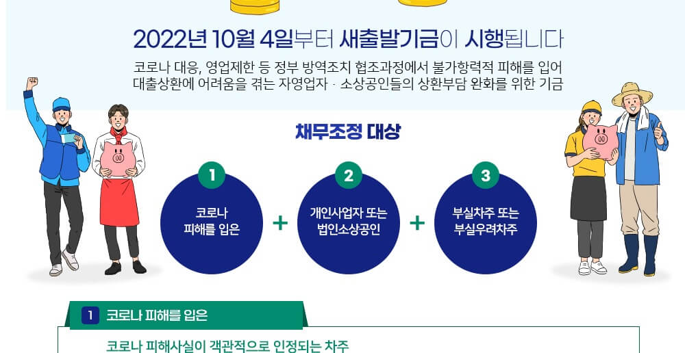 2022년 10월 4일부로 새출발기금이 시작되었다. 사업에 어려움을 겪어 대출 이자 상환에 압박의 어려움을 겪는 소상공인들에게 새출발할 수 있도록 새롭게 대출을 시행해 준다. 하지만 조건도 있다. 채무조정대상에 모든 이들이 다 가입할 수 있는 건 아니고 채무조정대상이 따로 있다. 그리고 이것들은 모두 대출이다. 그리고 담보대출, 무담보대출이 있다. 신청은 네이버에서 소상공인 새출발기금을 검색하면 사이트를 통하거나 현장 창구를 통해 직접 찾아가서 신청할 수 있다.