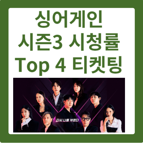 싱어게인 시즌 Top4에 대해 유튜브 조회수 중심으로 예상해 보았습니다. 탑 4 이름 프로필과 싱어게인 시즌 3 시청률과 온라인 사전 투표, 그리고 관객 초대 티켓팅을 알려드리겠습니다.