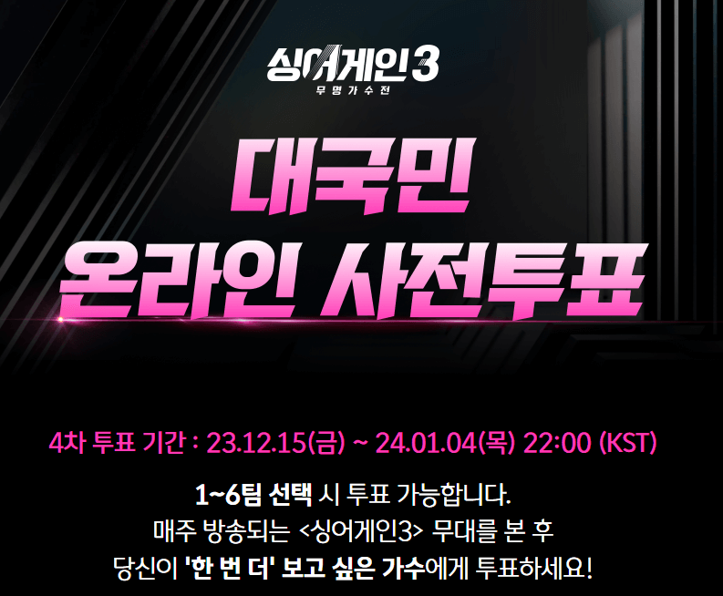 4차, 5차 1월 4일 기점으로 나뉘게 됩니다. 최애 가수에게 투표하세요. 아이디 당 한 번만 투표가 가능합니다. 한번 더 보고 싶은 가수는 1명에서부터 6명까지 투표 가능합니다. 꼭 방송을 보고 투표해 주세요. 이 모든 투표는 최종 심사에 반영이 됩니다.