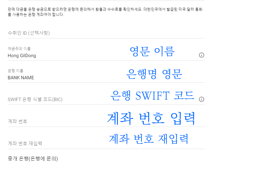 - 은행 이름은 애드센스 수익금 받을 은행으로 영문으로 입력하면 됩니다.