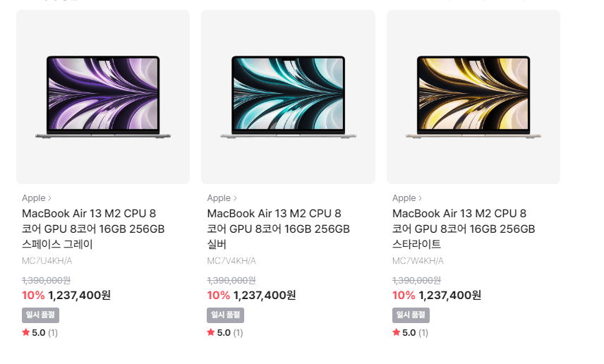 저렴한 맥북은 모두 일시 품절이었습니다. 카드사 할인에 쿠폰까지 더한다면, 그리고 할부 구입으로 인해, 저렴한 맥북과 맥미니는 구하기 어려웠습니다.