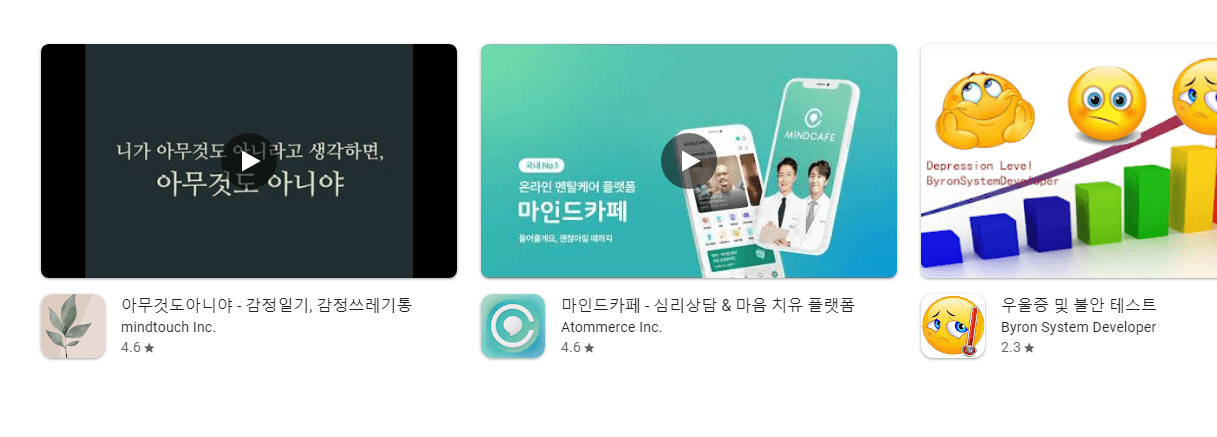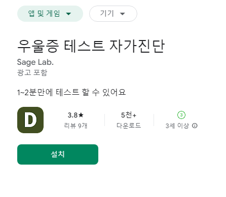 안드로이드에서 실행 가능한 구글 플레이에서 검색을 해보니 유사 어플이 몇 개 보였습니다. 우울증을 자가로 테스트해보는 것인데 자가로 진단하는 어플입니다. 무료이긴 하나, 단점은 광고가 뜬다는 것입니다.