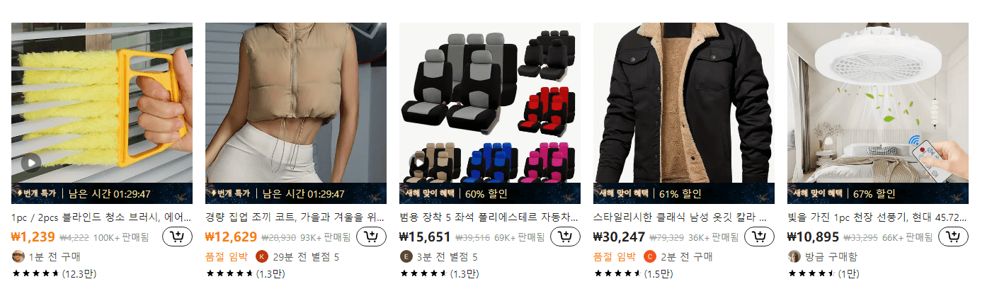 이렇게나 많은 상품들이 늘어져 있습니다. 알리와 함께 적극적으로 한국에 대시하고 있는 쇼핑몰 입니다.