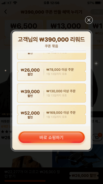 6500원어치 사면 6500원 할인, 26000원 이상 구입하면 13000원 할인하는 해주고 78,000원 이상 주문하면 26000원 할인, 13만 원 이상 주문해야 39,000원 할인을 해주는 등급 별 할인이었습니다.