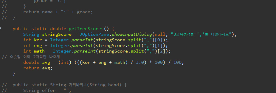04줄 String stringScore = JOptionPane.showInputDialog(null, "3과목성적을 ','로 나열하세요");
