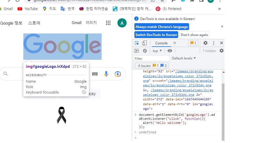 2. document.getElementByid('googleLogo') 를 치면 해당 문구를 불러올 수 있다.